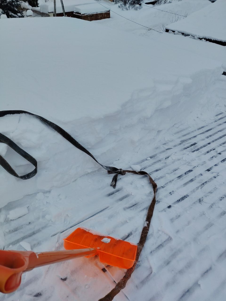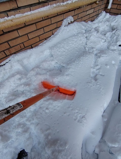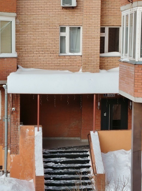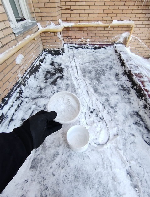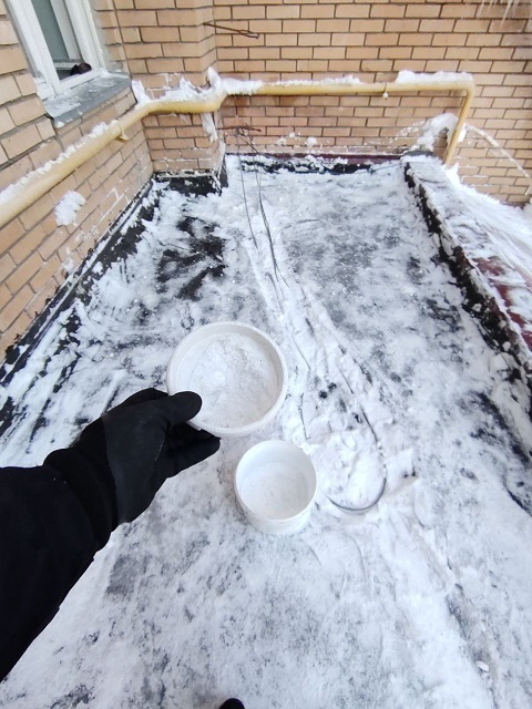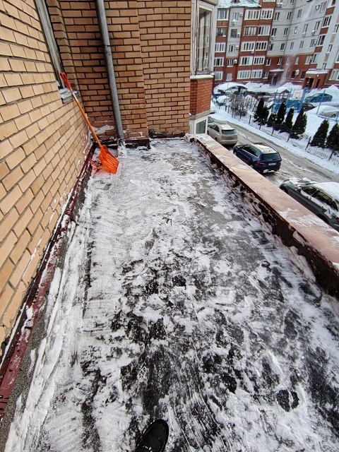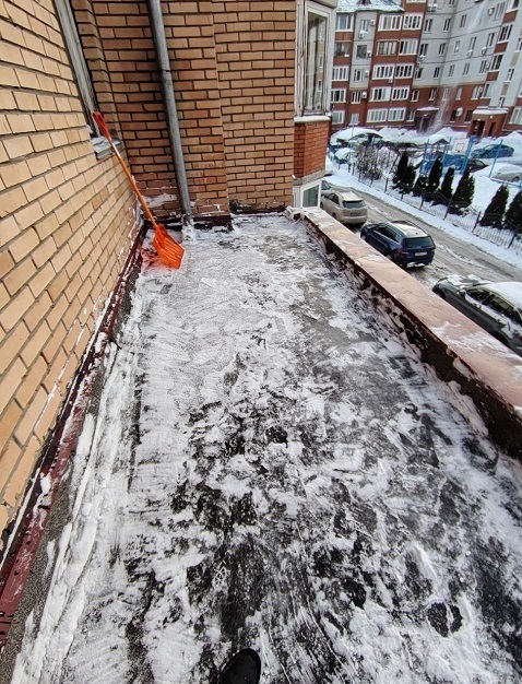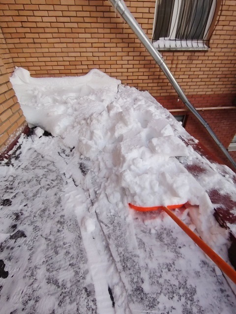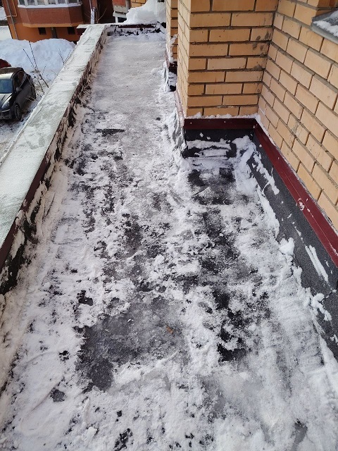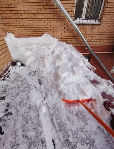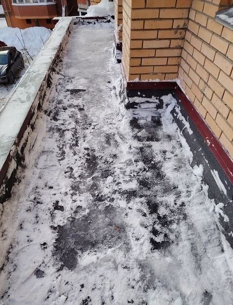 Проведены работы по чистке снега с козырьков четырёх подъездов и обработке поверхности кровли солью от наледи.